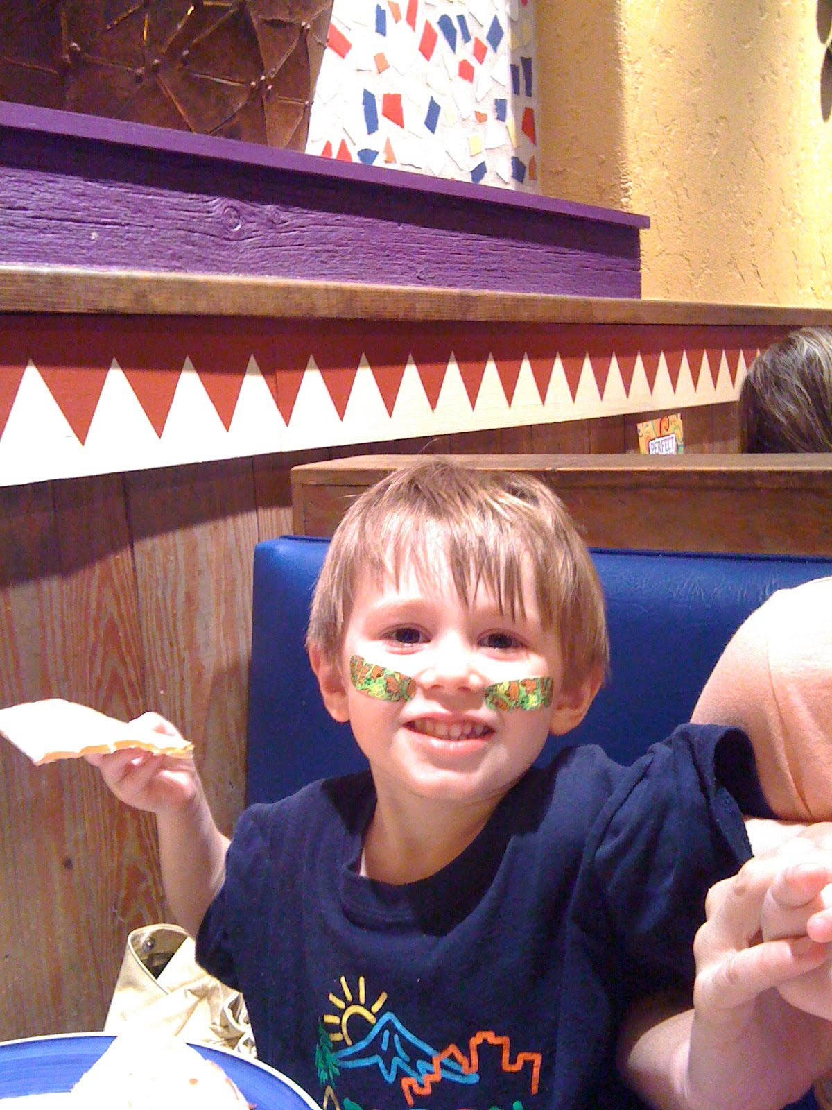 While his eyes were fine, it did hurt a lot and he had some burned patches. And in the universal expectation that a band aid can fix everything, he insisted on applying a couple (which I made sure were placed on unburned skin lower on his cheek bones). Then we went out to lunch.